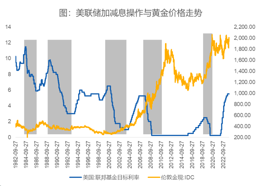 而历史上,美国降息周期中(下图中灰色圈住部分),金价往往会上涨。