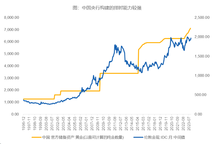 2、看买盘:央行今年买了不少黄金(下图橙色线)。从历史上看,央行的黄金择时能力很强,几乎每一次都买在了金价低位。这次央行下场采购,可能也是看好未来金价的上涨空间。