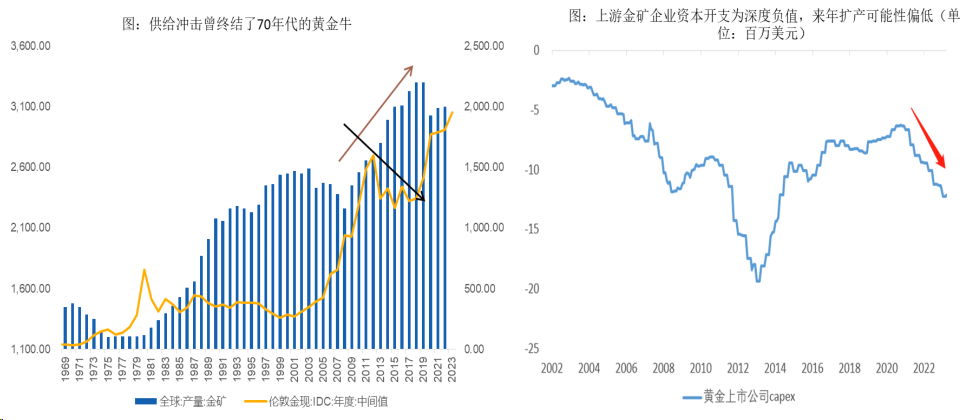 1、看风险:历史上“供给冲击”曾经终结了两轮黄金牛市。但这一次,根据上游金矿企业的财务数据,全球黄金开采加工业的资本开支(加大投资挖矿)还是负值、而且持续下行,所以明年黄金供给量大概率不会突然增加。