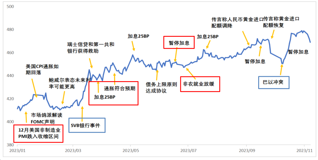 1、美联储偏鸽:美联储加息幅度低于预期、暂停加息,或者美国经济预期下滑,大多带动金价上涨(下图红色圈住部分);