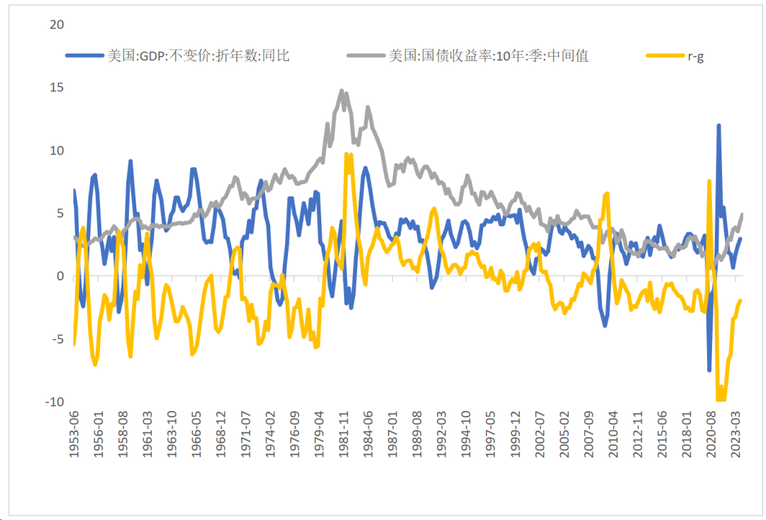 而现在来看,美国借贷利率飙升(下图灰色线)、而撬动的经济增速却没那么快(下图蓝色线),大财政的性价比走低(下图橙色线为“借款利率-经济增速”,近期开始快速反弹)。所以从这个角度来看,美国经济韧性下降,美联储降息的概率就会提升。