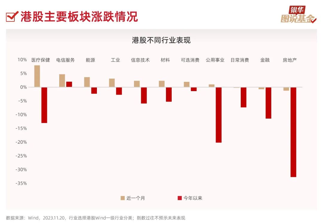 2、从行业上看,今年以来港股各行业均累计负收益,特别是房地产及公用事业。而近一个月以来,医疗保健、电信服务、能源、工业等则呈现反弹趋势。