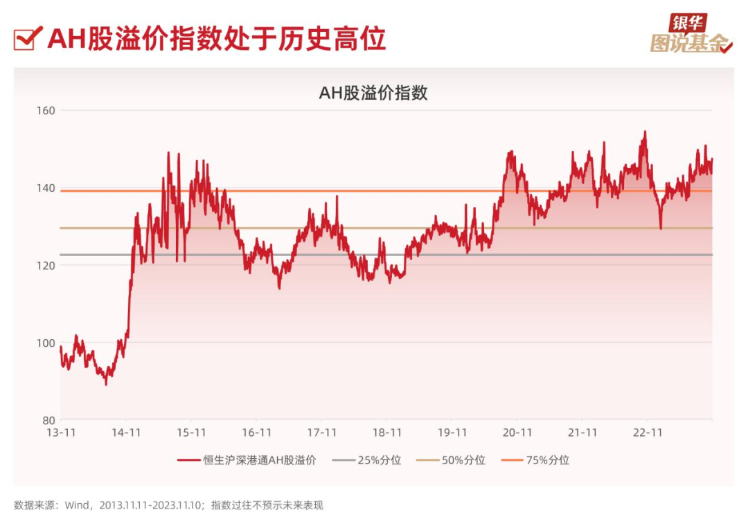 6、AH股溢价指数是追踪内地和香港两地同时上市股票的价格差异的一种指标。由于两地的流动性、投资者结构、估值水平、参与机构的认知等股价相关影响因素不同,导致AH股股价存在长期的价差。目前AH股溢价指数达到147.46,处于近十年历史高位。