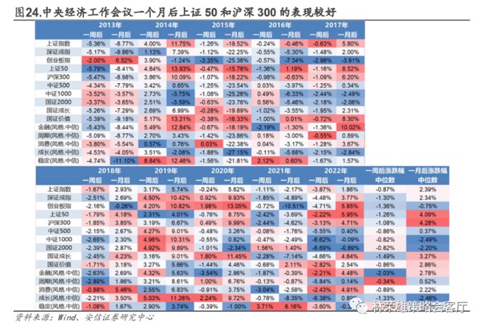 如下图所示,复盘近十年**经济工作会议之后的市场表现,从会议召开后一个月的维度来看,上证指数、上证50和沪深300的的涨跌幅中位数分别为2.39%、4.09%和4.28%,市场具备较大的回暖概率。(来源:安信证券)