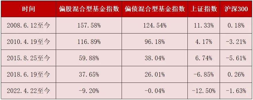 可以看出,在3000点附近震荡市买入上述指数并持有至今,虽然上证指数和沪深300表现一般,但偏股混合型基金指数和偏债混合型基金指数总体呈现“只输时间不输钱”,所以有时候选择比努力更重要。