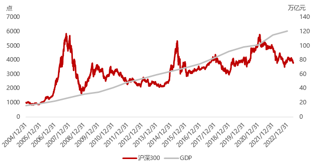 只要经济长期向好发展,优质的宽基指数指数中长期趋势向上。以宽基指数的典型代表沪深300为例。**GDP从2004年12月31日的16.18万亿元,涨到了2022年12月31日的121.02万亿元,涨幅高达648%。同期沪深300指数从成立之初的1000点,涨到3871.63点,也实现了287%的涨幅。(数据来源:Wind)