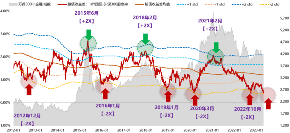 (数据来源:Wind,天风证券,统计区间2013.5.27-2023.5.26,股债收益差采用10年期国债收益率减去万得300除金融(881007.WI)股息率计算,标准差使用数据当前时间点过去3年的数据进行计算。)