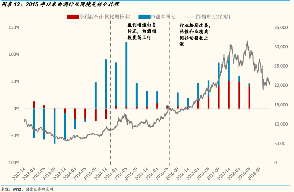 以白酒板块为例。2012 年 11 月爆出白酒塑化剂事件后白酒行业需求跌入谷底,随后受“**”消费治理趋紧和宏观经济增幅放缓等因素影响,2013 年上市白酒企业的净利润较 2012 年下滑了 11.85%,指数进入熊途。