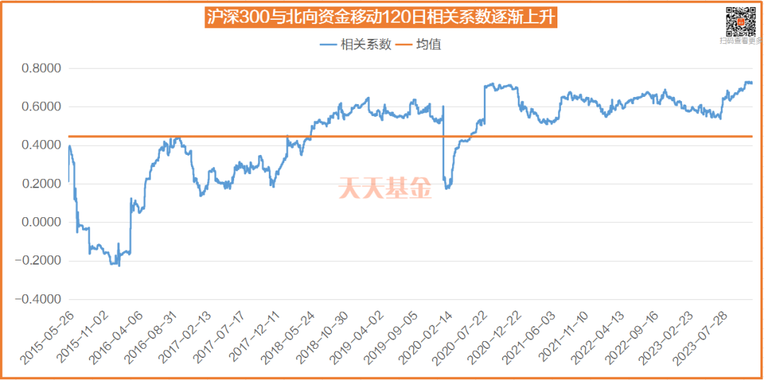 从时间纵向维度来看,沪深300收益率与北上资金的相关性有逐年上升的趋势,2015年15月至2023年12月期间,二者相关系数均值为0.45,**值为0.73。