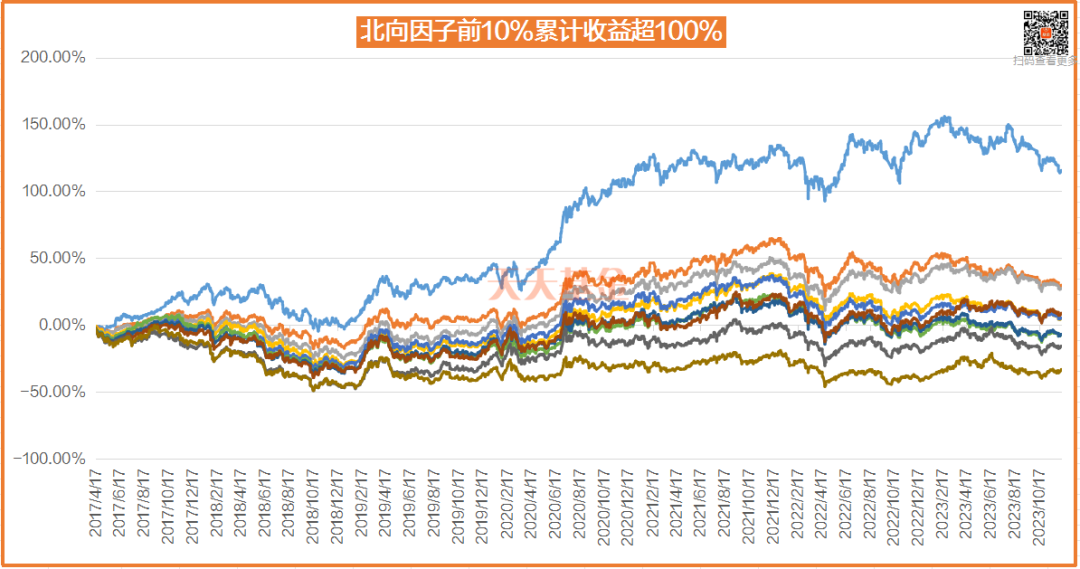(注:数据来源choice,数据区间2017-4-5至2023-12-12,划分为10层,累计收益表现如上图,不作投资推荐)