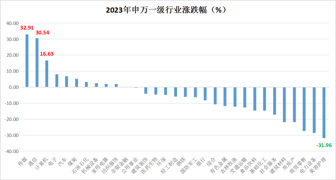 从板块来看,受“AI ”人工智能浪潮以及集成电路国产替代影响,通信、传媒、计算机和电子表现强势,受经济弱复苏、需求与通胀不及预期影响,商贸零售、美容护理等产业表现不佳。