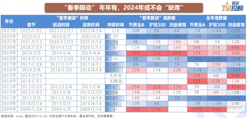 A股出现“春季躁动”的概率较高,2009年以来几乎每一年都会出现“春季躁动”,春季躁动对全年行情没有决定性的影响,但在2018年、2022年“春季躁动”较差的年份,全年的表现也较差。2024年,随着政策加码、中美周期底部共振,“春季躁动”或将再度成为市场的“关键词”。