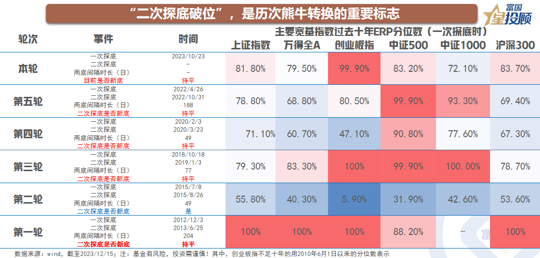 A股历史上出现过几次典型“二次探底”,比如2018年年底、2020年3月、以及2022年10月底。可以发现,前期的底部一般会对二次探底形成重要的支撑,特别是在估值、风险偏好较低的环境中。回看当前,主要宽基指数的ERF(风险溢价)已处在历史偏高的位置,性价比较好的背景下,“春季躁动”或许可以期待。