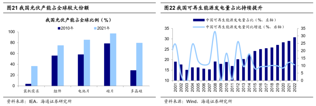 与此同时,我国相关产业链在全球已占据优势地位,根据IEA的数据,21年我国组件产能全球占比达75%、电池片为85%、硅片为97%、多晶硅为79%。