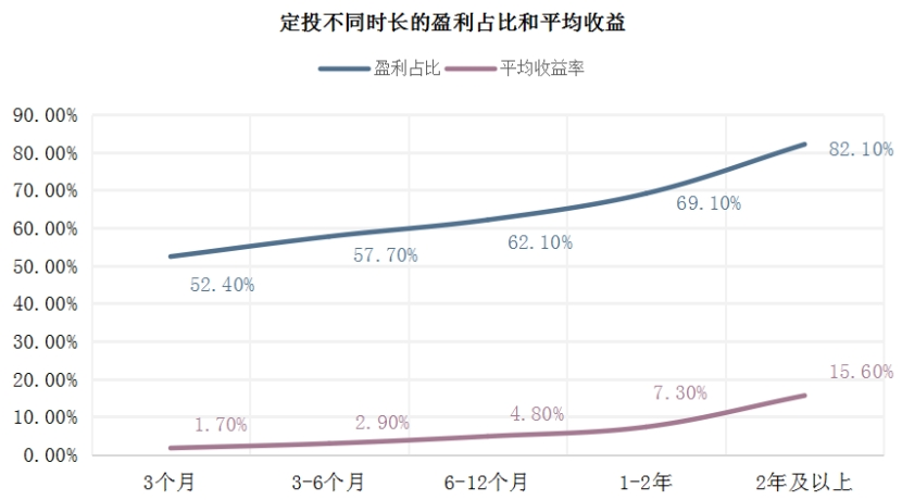 根据**基金报等联合发布的2022年《公募基金投资者定投洞察报告》显示,定投坚持2年以上的交易,盈利占比超80%,且在这段区间内,随着定投时间拉长,盈利占比也逐渐增加。