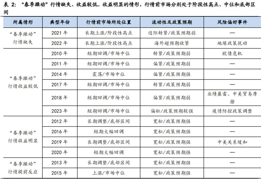 根据国海证券的复盘,2010年以来的14年中,按波段**收益划分,春季躁动可以分为缺席、提前、收益一般和收益明显四种类型,缺席和提前分别出现过2次,4次收益明显,6次收益一般。