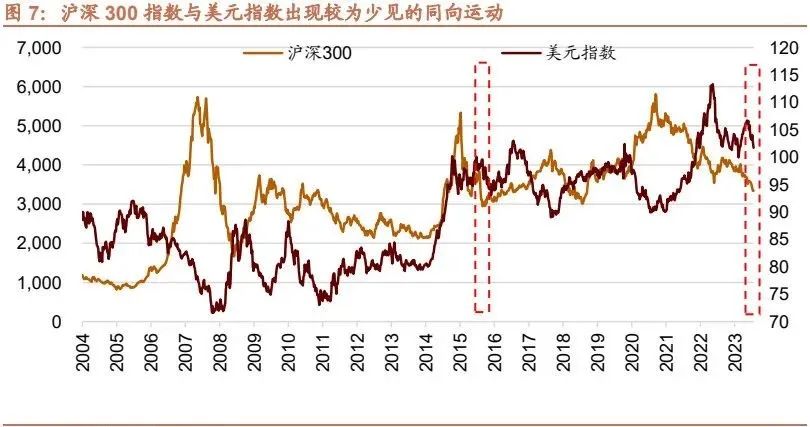 极值四:沪深300指数与美元指数出现了较长时间同向波动
