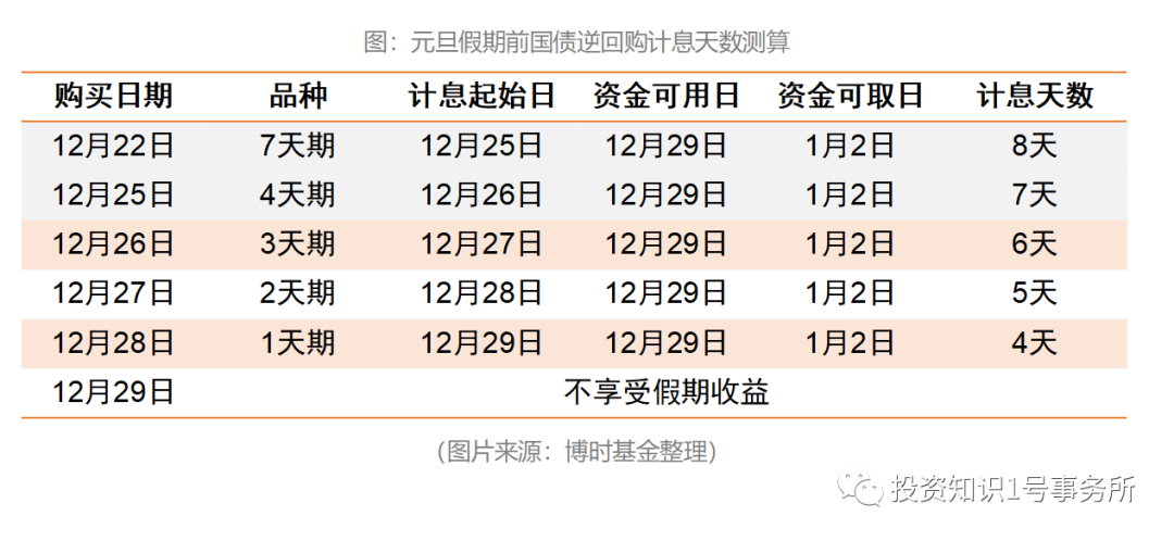 如果还是难以理解,所长这里简单测算了一下元旦假期前各期限品种的计息天数,大家可以根据下表挑选适合自己流动性需求的选项进行操作。除此之外,目前多数交易软件也都支持计息测算,会在购买时提示将占用资金的天数,以及相应的计息天数。