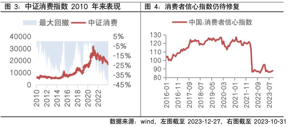 2023年的消费复苏进程偏**,疫情的疤痕效应和居民收入预期的不理想,也对消费者信心修复带来了**压力,压制了消费板块的表现。此外,2022年**人口**出现负增长,叠加人口老龄化程度持续加深,消费的长期逻辑有所受损。在此背景下,中证消费指数自2021年初高点的**回撤达49%,已和2015年股灾的调整幅度相当。