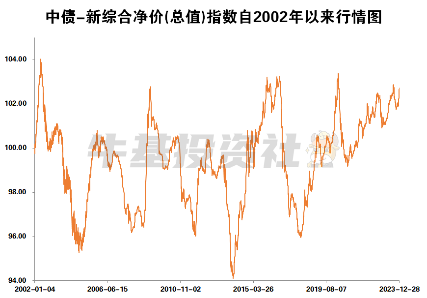 净价指数只考虑了债券本身价格,没有考虑债券利息,所以如果我们看历史走势图会发现中债-新综合净价(总值)指数资自2002年以来长期围绕100上下波动。