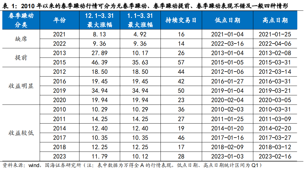 国海证券统计了2010年以来,到2023年间每一年“春季躁动”期间的情况。过往一年12月1日至当年3月31日,以及当年一季度这两个时间段里,万得全A自**点到**点之间的**涨幅为判断依据,对“春季躁动”行情进行分类。