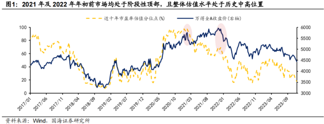 2020年至2021年全年市场整体呈现震荡上行趋势,2020年在全球流动性宽松共振下,根据国海证券及wind数据显示,全年万得全A涨幅达25.6%,2021年1月初万得全A近十年估值分位已处于96%水平;而2021年在新能源产业**爆发的催化下,万得全A震荡上行,2022年1月初万得全A近十年估值分位达到69%。