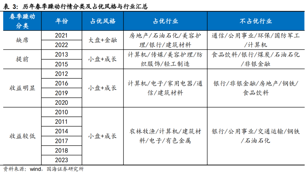 从国海证券的统计数据来看,历史上不同类型的“春季躁动”期间,占优的风格和行业略有不同。