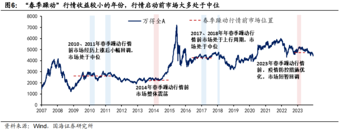 2010-2011、2014、2017-2018以及2023这六年春季躁动收益一般,核心原因在于市场位置不高不低,行情启动前市场大多处于中位区间。