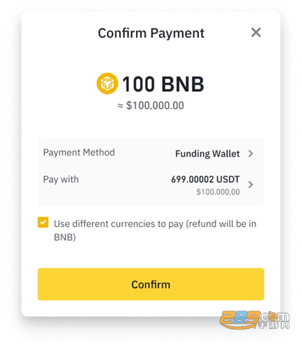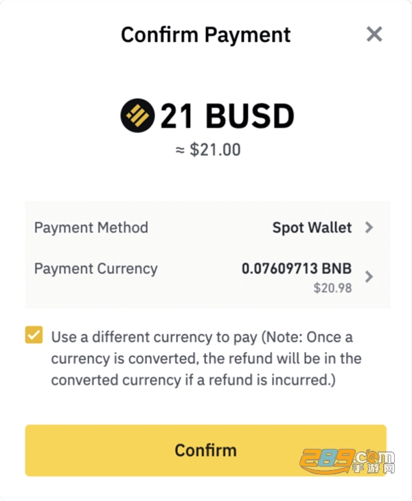 3、如果您没有购买该物品所需的加密货币,那么可在资**包或现货钱包中兑换为其他加密货币进行支付。仅需选择【使用不同货币支付】旁的框,并点击【确认】。