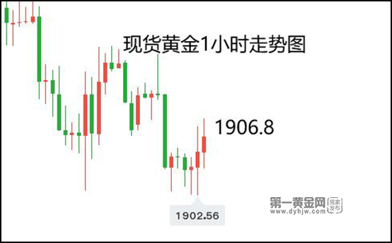 日内黄金反弹受阻1913美元后继续下行,1900关口止跌小幅反弹,截至周四下午发稿,报价在1906.8美元/盎司。