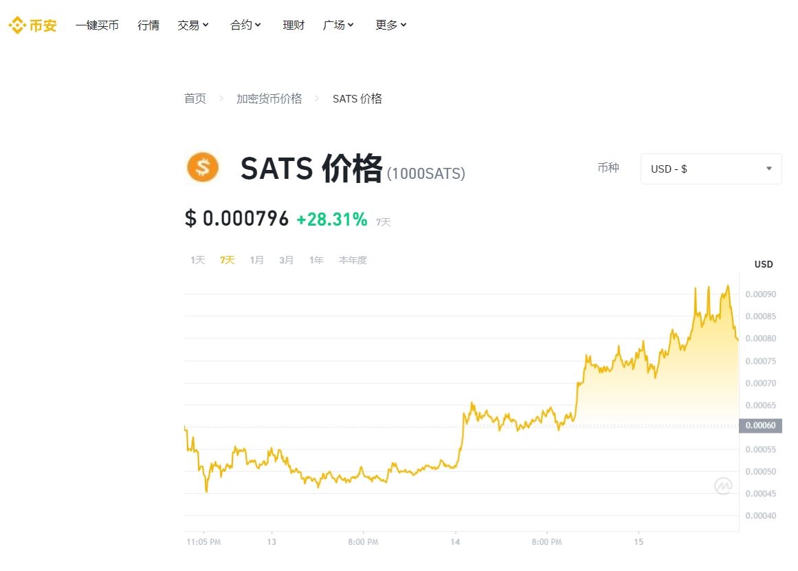 这一消息让 SATS 价格在短短几小时内飙升了约140%,截至目前历史**价为 0.000928,**报价为 0.000796。
