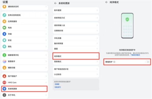 首先,您需要退出纯净模式并关闭外部来源应用检查。在华为手机的主页上,进入【设置】-【系统和更新】-【纯净模式】,然后关闭【增强防护】。接下来,在【设置】-【安全】-【更多安全设置】中,关闭【外部来源应用检查】。