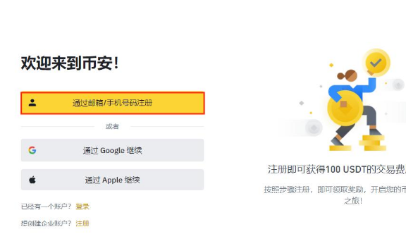1.在币安交易所(点击注册 )首页点击【通过手机号码/邮箱注册】进入注册页面。
