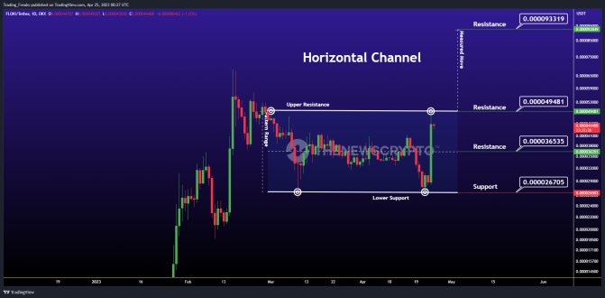 在上面的图表中,FLOKI(弗洛基)布置了一个水平通道模式,水平通道模式也被称为横盘趋势。一般来说,水平通道是在价格盘整期间形成的。在此模式中,上方趋势线(连接高点的线)和下方趋势线(连接低点的线)水平平行,价格走势包含在其中。