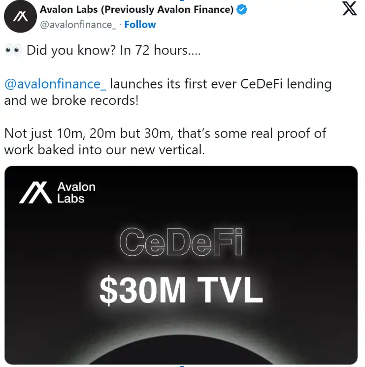今天我们来了解一个通过其创新的 CeDeFi 平台在金融领域实现正和博弈的项目 Avalon Labs。Avalon Labs 是 CeDeFi 和 BTC LSDFi 借贷的**市场,并且致力于成为 BTC 生态系统中**的借贷平台,并已部署在多个主流区块链网络上,如 Arbitrum、BNB Chain、Bitlayer、CoreDAO、Ethereum 和 Merlin。