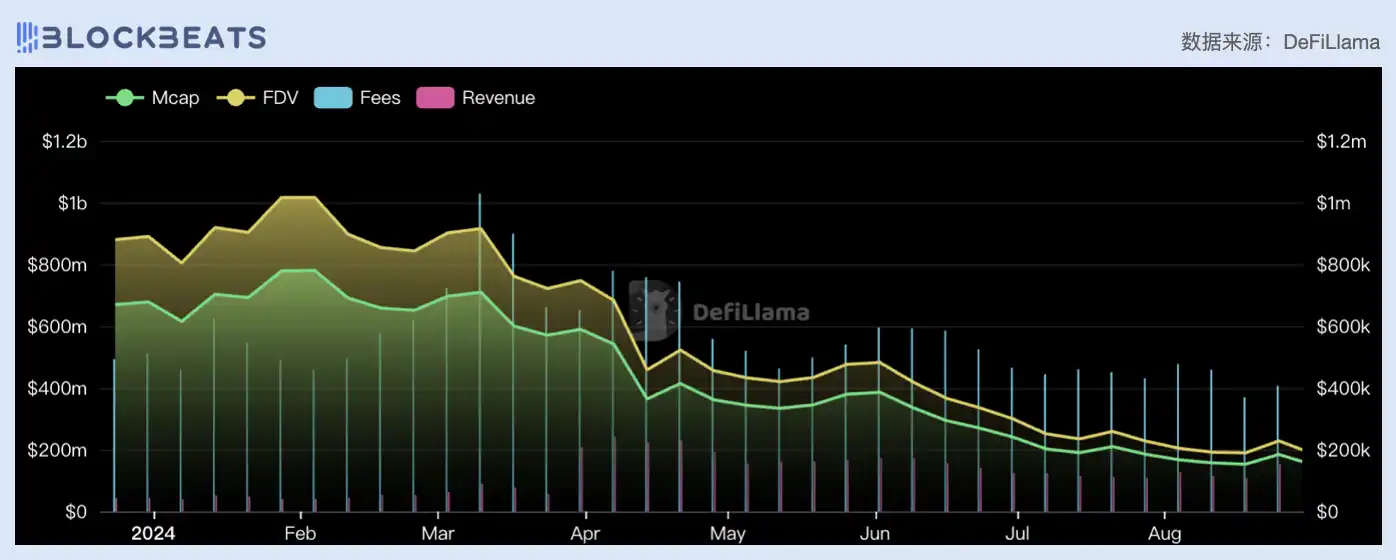 Pendle Finance 是链上利率衍生品市场的先行者。2023 年,这个市场经历了显著的增长,Pendle 在 2023 年 Q4 的流通 PE 指数达 555,在 2024 年前半年经历了大幅回落跌至 77.9,在近期回升到 180 附近。