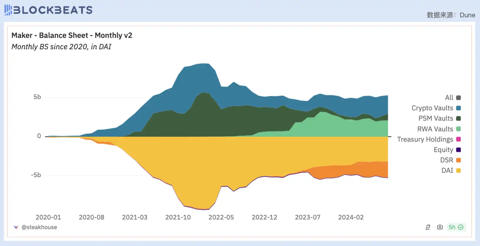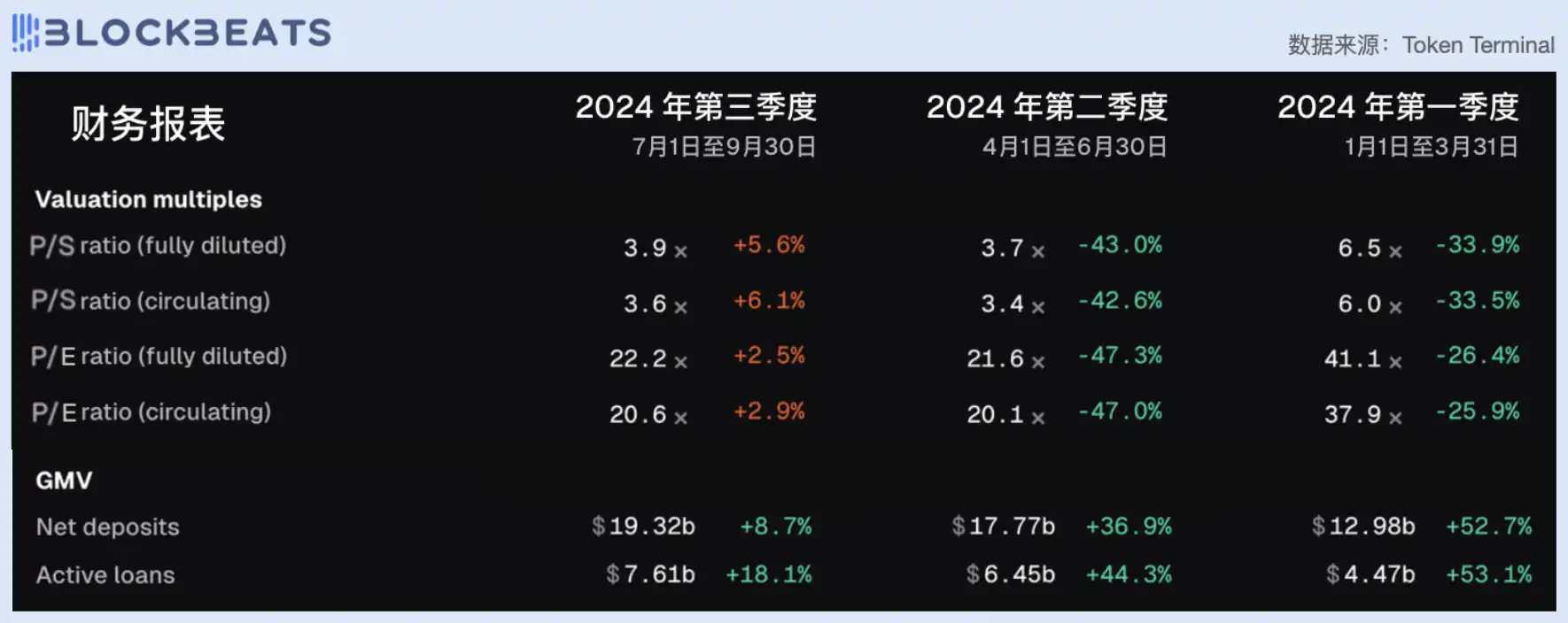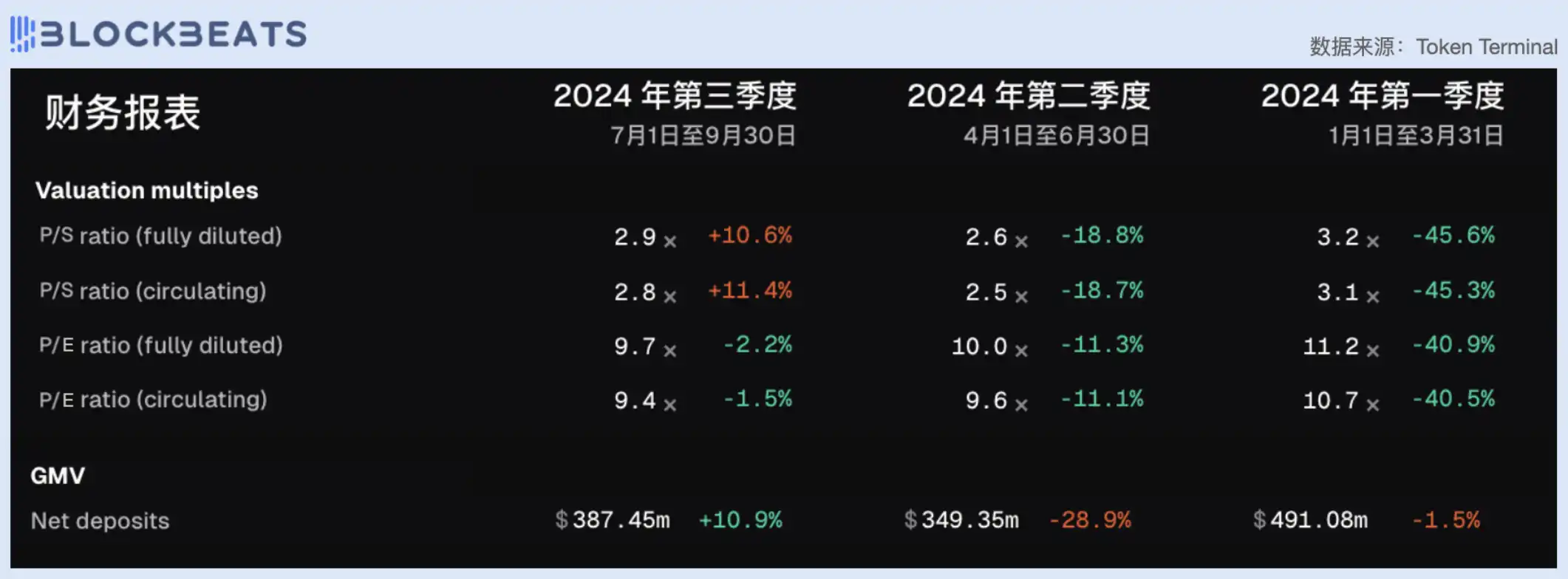 MakerDAO 的 PE 值今年一直较为稳定,三个季度都保持 8 左右。在项目发展历史上属于较低水平,仅次于 2023 年第四季度,彼时 MakerDAO 的市销率仅为 6.3。与此同时 MakerDAO GMV 也维持在一个稳定水平,与去年四个季度相比相差无几。