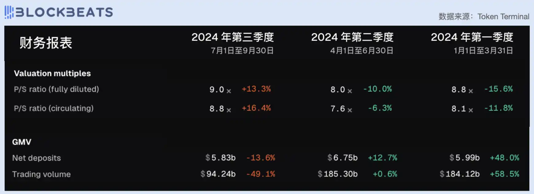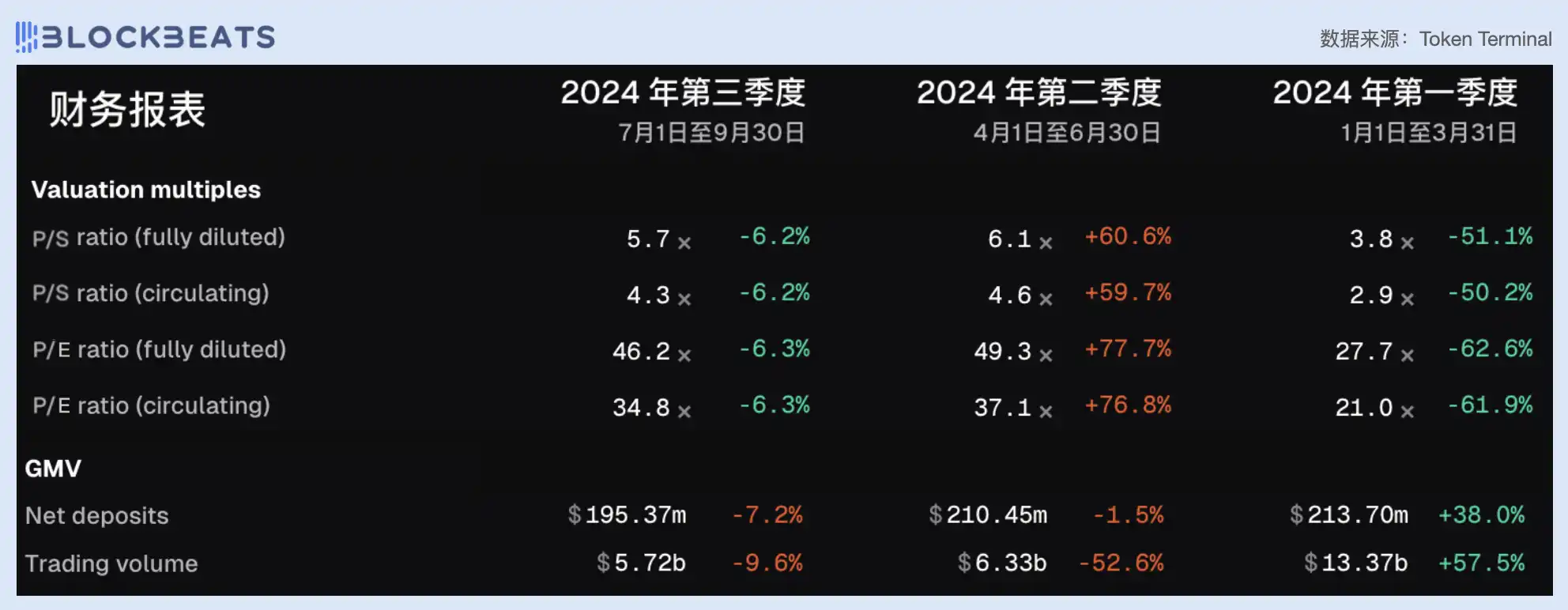 Trader Joe 2024 年前三个季度的估值倍数和 GMV 指标都有显著的波动。第二季度 P/E 估值倍数**上升,增长了 76%。之后,Trader Joe 的收入和交易量维持在相对稳定的水平,市场对 Trader Joe 的增长预期表现稳定。