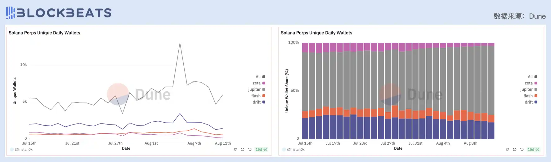 尽管表面上看,Jupiter 的 DEX 聚合业务并不直接产生盈利,但其市占率优势使得 Jupiter 成为 Solana 生态用户进行交易的**入口。这种流量优势为其 Perps 产品带来大量流量支持。在 Solana 生态的永续合约产品中,Jupiter 的每日独立钱包数量占比超过 70%,远超其他产品如 Drift、Zeta 和 Flash。