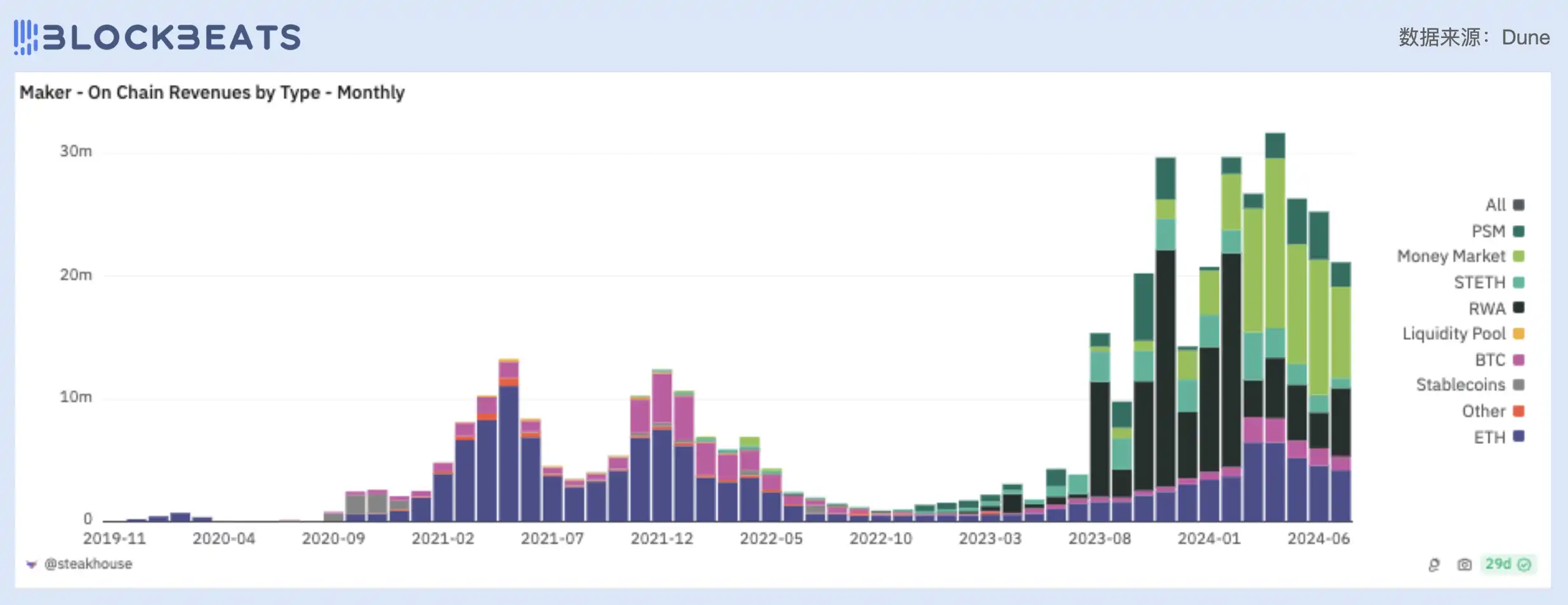MakerDAO 可以说是除了 Uniswap 之外最会赚钱的 DeFi 协议,收入来源主要包括 RWA 收益、用户支付的稳定费、清算罚金。得益于 2022 年的 RWA 转向,MakerDAO 将 80% 的资金分配给美国短期国债,20% 分配给投资级公司债券,以获取利息收益。这不仅推动了整体费用增加,还使 MakerDAO 拥有更稳定和多样化的收入来源。从 MakerDAO 当前的收入类型来看,RWA 占据收入的绝大部分。