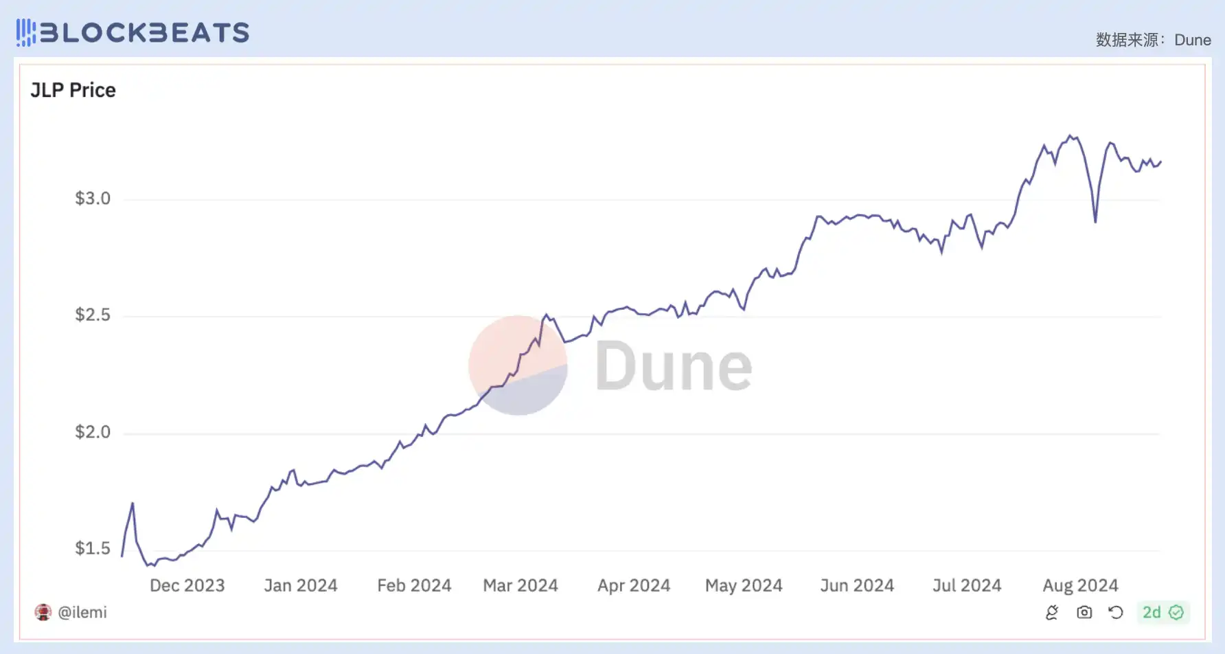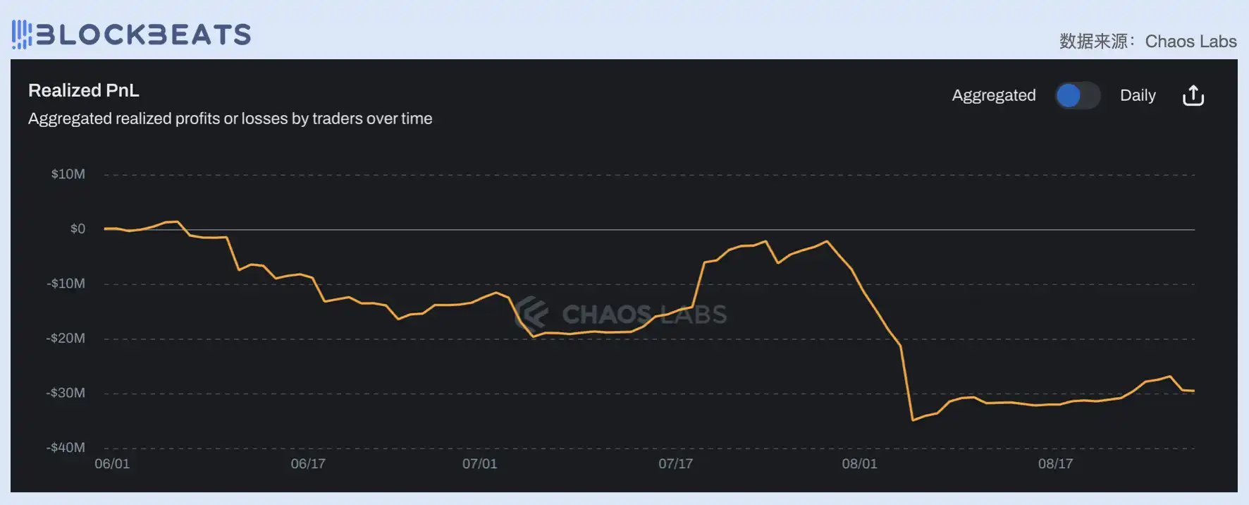 Jupiter 永续合约产品的交易手续费中,日交易量主要在 2 亿美元到 9 亿美元之间,8 月 5 日时峰值 16 亿美元的峰值。与之相对应的是合约用户的持续亏损,据 Chaos Labs 数据显示,Jupiter 永续合约产品上的交易者近三个月以来都处于亏损状态,在 8 月 5 日市场遭遇大幅波动时,交易者的亏损金额超过 3000 万美元,这些亏损为 Jupiter 带去了清算收入。可以说在理想情况下,大盘上涨时,JLP 作为「加密市场蓝筹 ETF」可以与市场同频上涨,而当市场结束单边上涨行情时,在 Jupiter perps 上的交易者亏损变多,JLP 收益也会增加,实现正向飞轮。