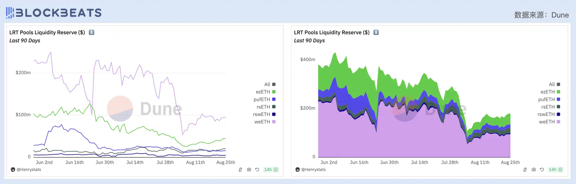 4 月的以太坊质押热潮为 Pendle 带去了巨量的流动性资金,这种繁荣一直持续到六月初。Pendle 上大部分交易都集中在与以太坊及其相关再质押**上,在这段时间的繁荣体面依赖如 Etherfi、Ethena 和 Renzo 等 LRT 协议的空投激励,这些协议都为 Pendle 上的流动性提供者赋予了 2-4.5 倍的空投积分乘数,也为 Pendle 之后的业务发展埋下了风险。