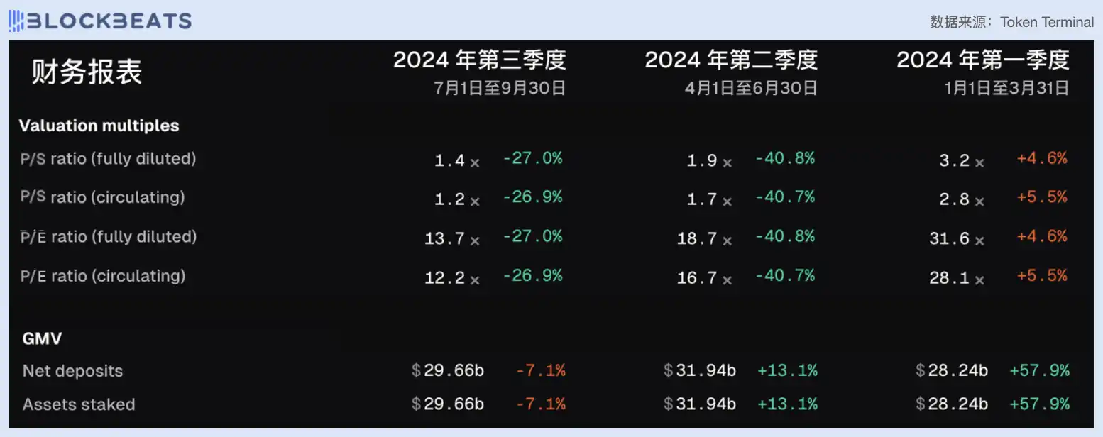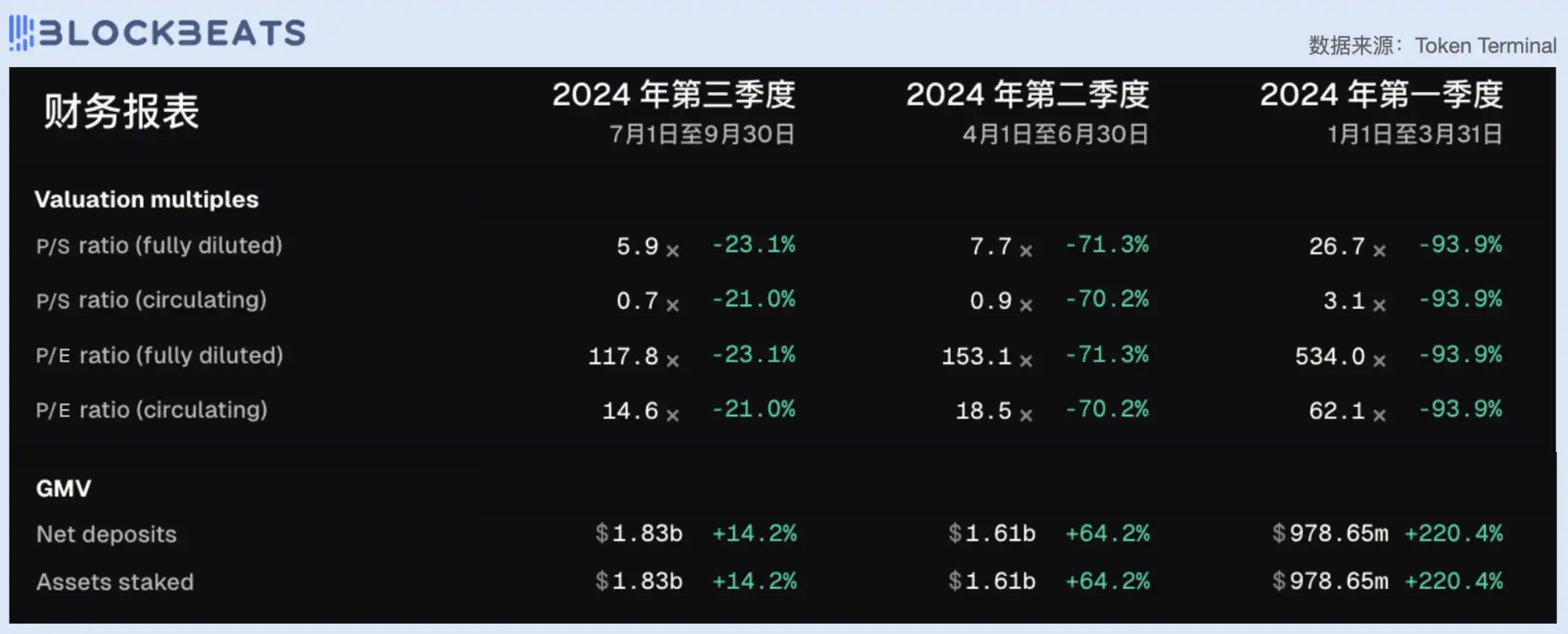 但随着项目伊始阶段的红利期结束以及竞争对手的增多,市场对 Jito 的估值预期在逐渐回到正常水平。从**季度 Solana 生态火热起势,Jito 刚刚完成空投并且上线各大交易平台,PE 值高达 534。但第二季度市场情绪趋于冷静后,Jito 的 PE 值回落至 153,目前稳定在 120 上下。但 Jito 的 GMV 也在稳定增加,目前第三季度还未结束就已经超过第二季度总额。
