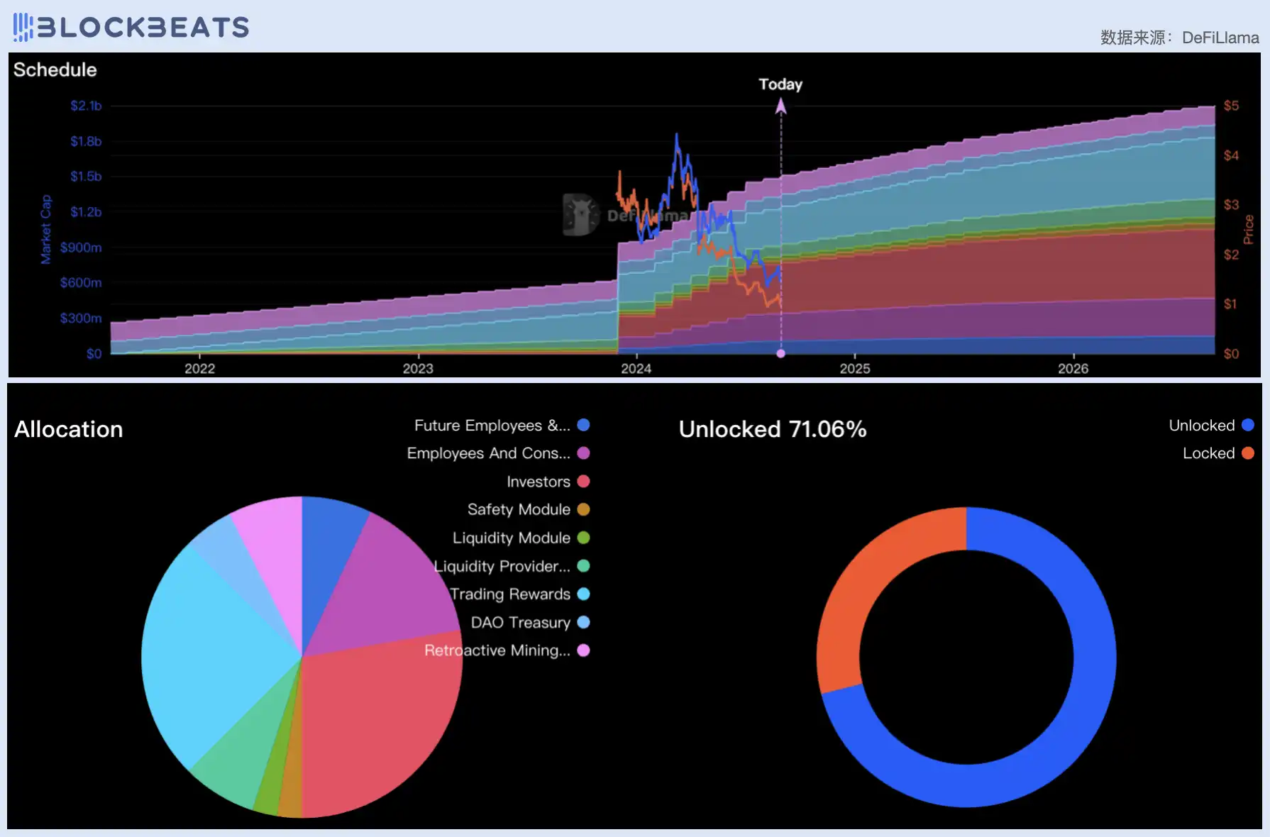 在市场增长受阻之外,** DYDX 还面临着大额解锁的抛压。DYDX 自 2023 年 12 月 1 日其开始进行大额筹码解锁,一次性解锁占总供应量的 15%,其余 35% 每月分批次解锁,6 年内释放完毕。这些**份额主要来自投资者、创办人、顾问及员工,占流通供应量的高达 84.41%。目前,dYdX 还有 71.06% 的**没有解锁。