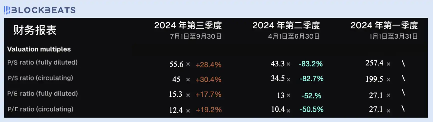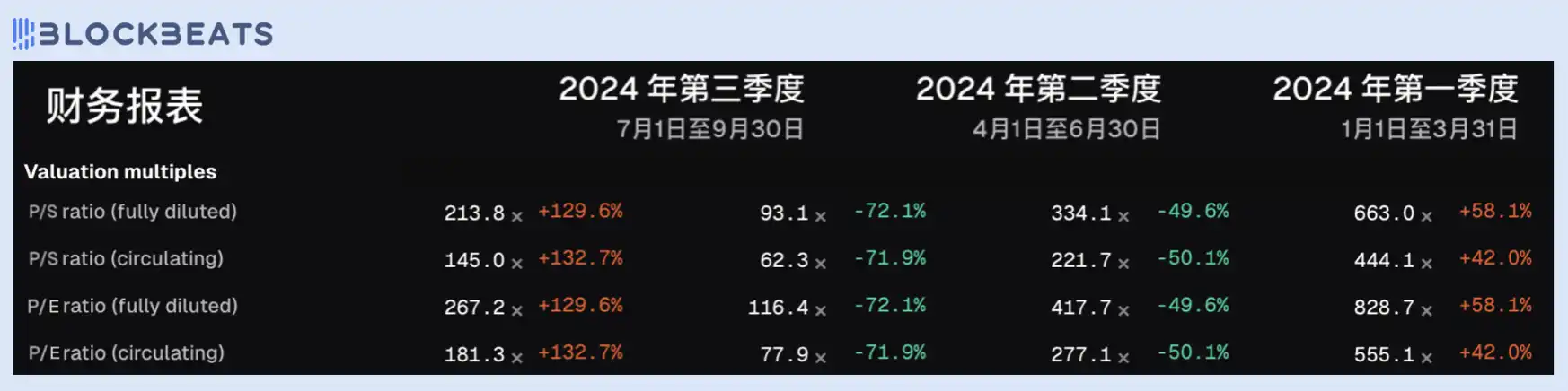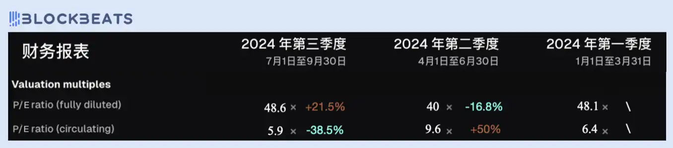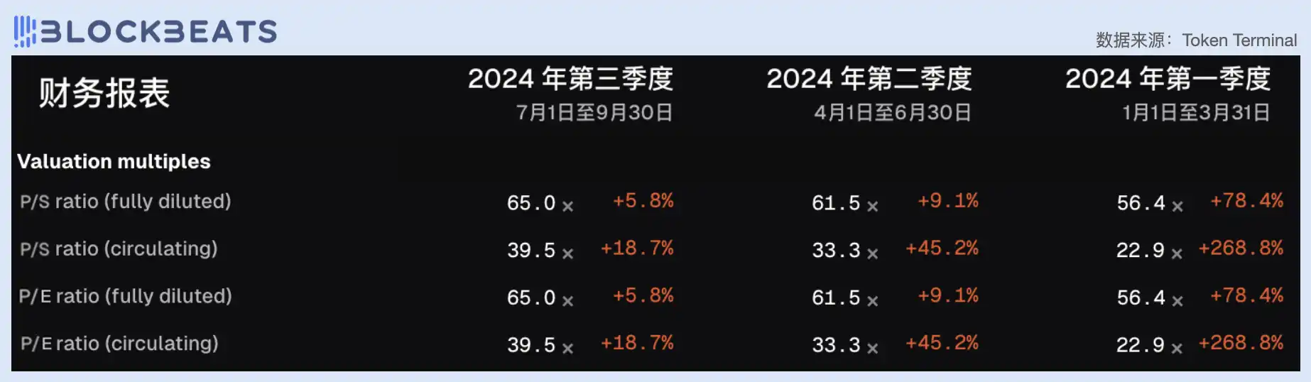 BlockBeats 注:在本文中,我们以 P/E 市盈率作为判断协议估值水平的主要指标。其中协议费用收入(Fees)视为营收,以此计算其 P/S 市销率,而协议利润(Revenue)则是在扣除各方利益分配后协议或者 DAO 所得的实际利润,以此计算其 P/E 市盈率。另外,由于第三季度尚未结束,因此当季表现将据 7、8 月数据均值预估。