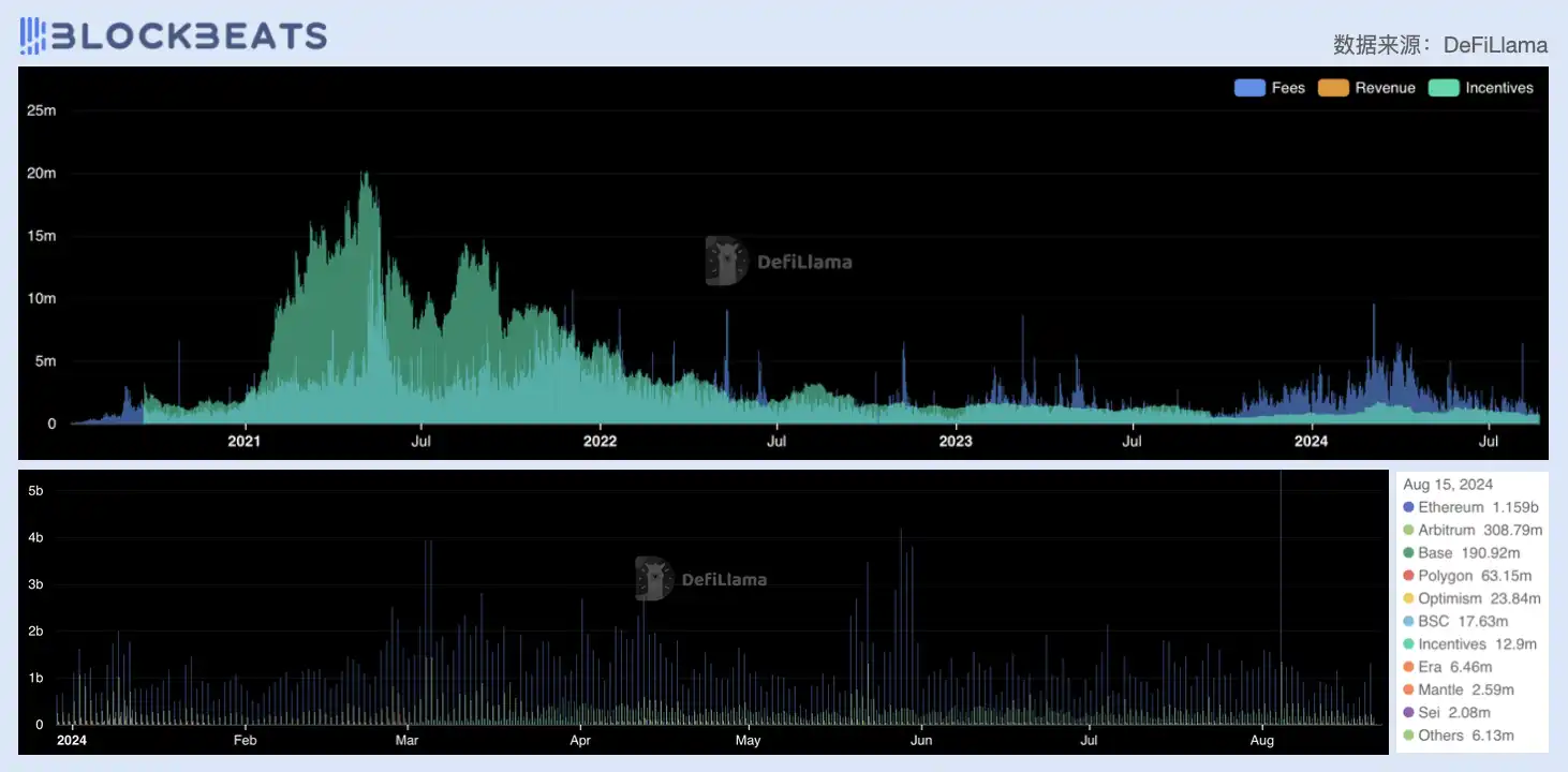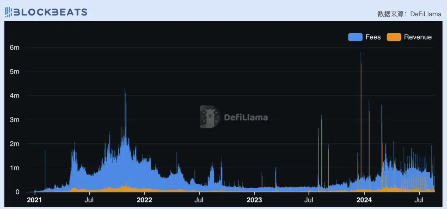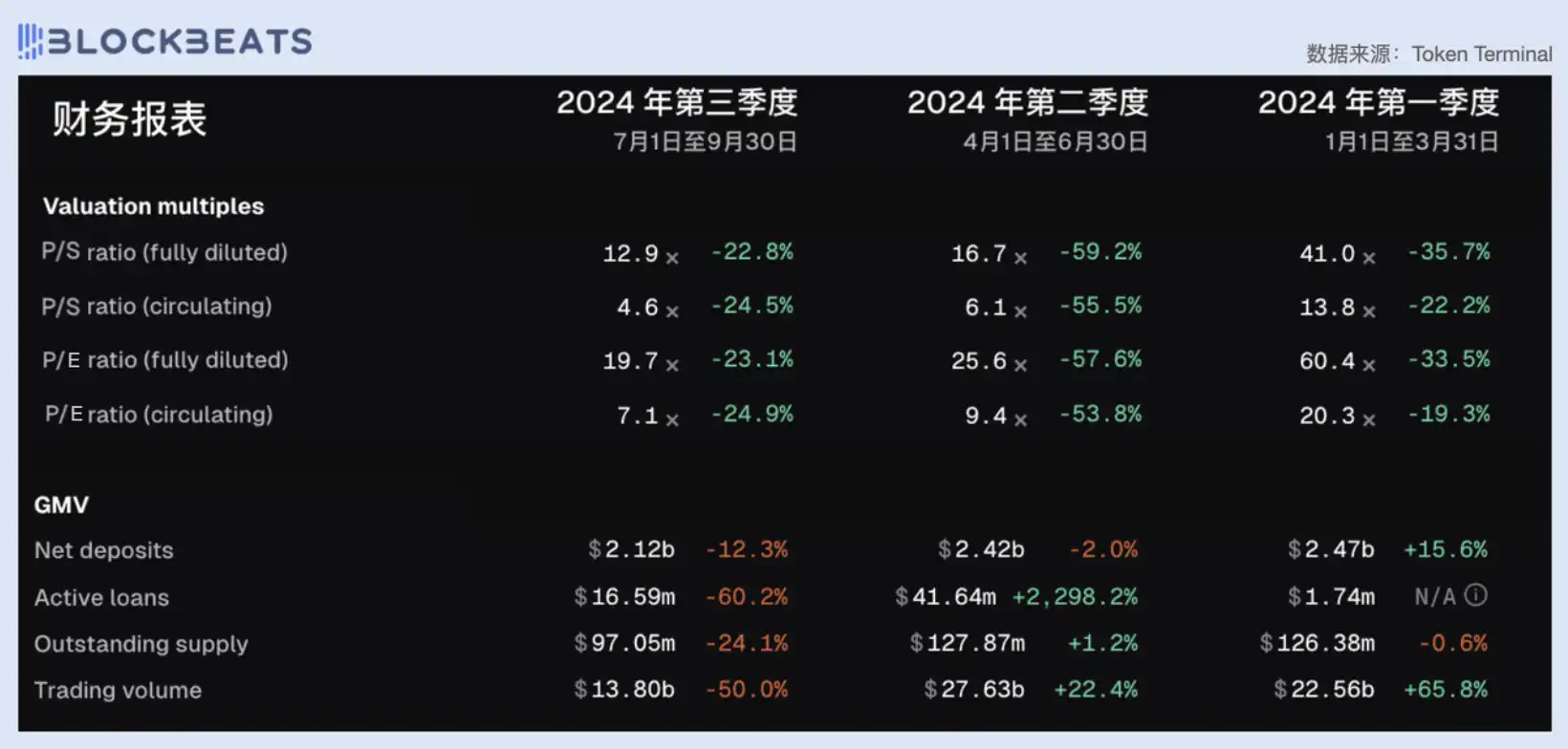 BlockBeats 注:在本文中,我们以 P/E 市盈率作为判断协议估值水平的主要指标。其中协议费用收入(Fees)视为营收,以此计算其 P/S 市销率,而协议利润(Revenue)则是在扣除各方利益分配后协议或者 DAO 所得的实际利润,以此计算其 P/E 市盈率。另外,由于第三季度尚未结束,因此当季表现将据 7、8 月数据均值预估。