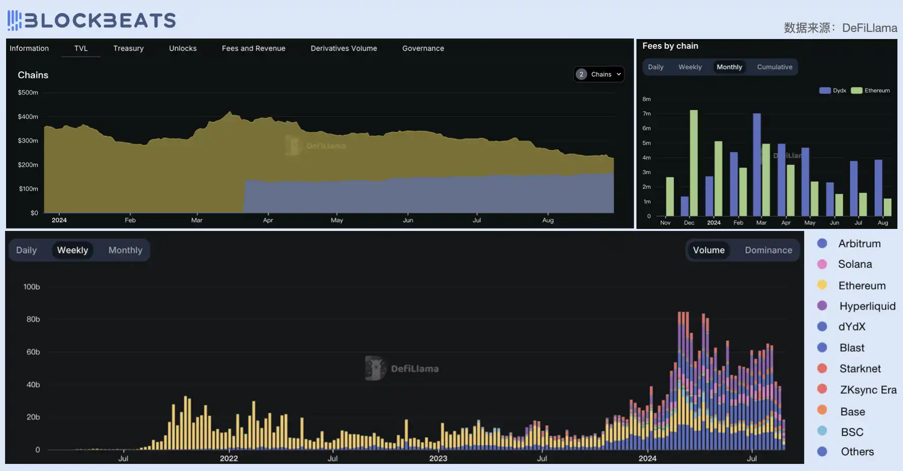 从费用来源上看,dYdX Chain 的费用已经逐步成为协议的主要收益来源,二者在 8 月所产生的费用分别为 389 万美元和 119 万美元,这表明 dYdX 的迁徙计划是成功的。但在当前衍生品协议的存量市场竞争中,dYdX 已颓势初显。从市占率上看,dYdX 不断从过去的**垄断地位退化下来,被 Hyperliquid、Jupiter、GMX 等新兴产品抢占了市场,目前交易量仅占 Perp DEX 总量的不到 20%。
