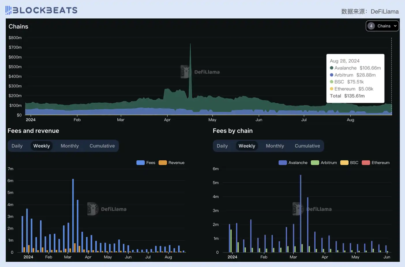 2024 年初以来,Trader Joe 的 TVL 维持在 1.5 亿到 2 亿美元之间,在 4 月至 6 月期间有较繁荣的表现,近一个月 TVL 已经降至 1 亿美元以下。Trader Joe 的 TVL 主要分布在 Avalanche($114.26M) 和 Arbitrum($45.38M),分别占总 TVL 的较**例,相应的,Avalanche 也是 Trader Joe 的主要的手续费贡献来源,占比大约在 60% - 70% 之间,其次是 Arbitrum,占比 21%。