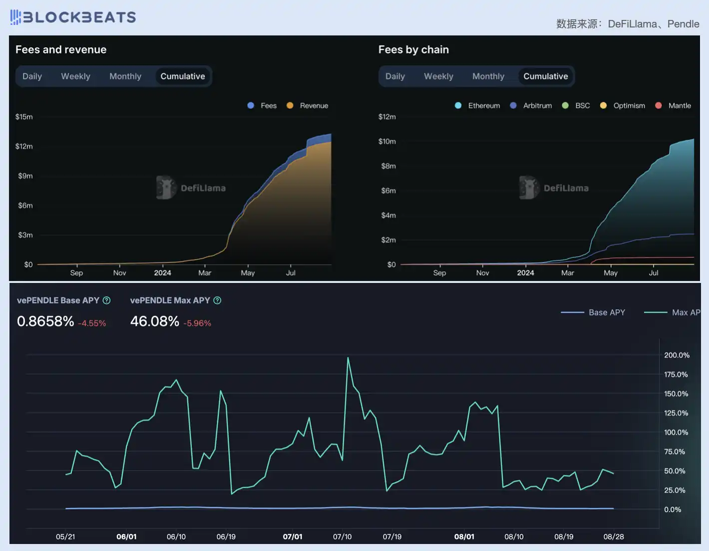 左上:Pendle 协议累计费用收入及利润;右上:Pendle 各链累计费用收入来源细分;下:过去 90 天 vePendle 基础 APY 及** APY 变化
