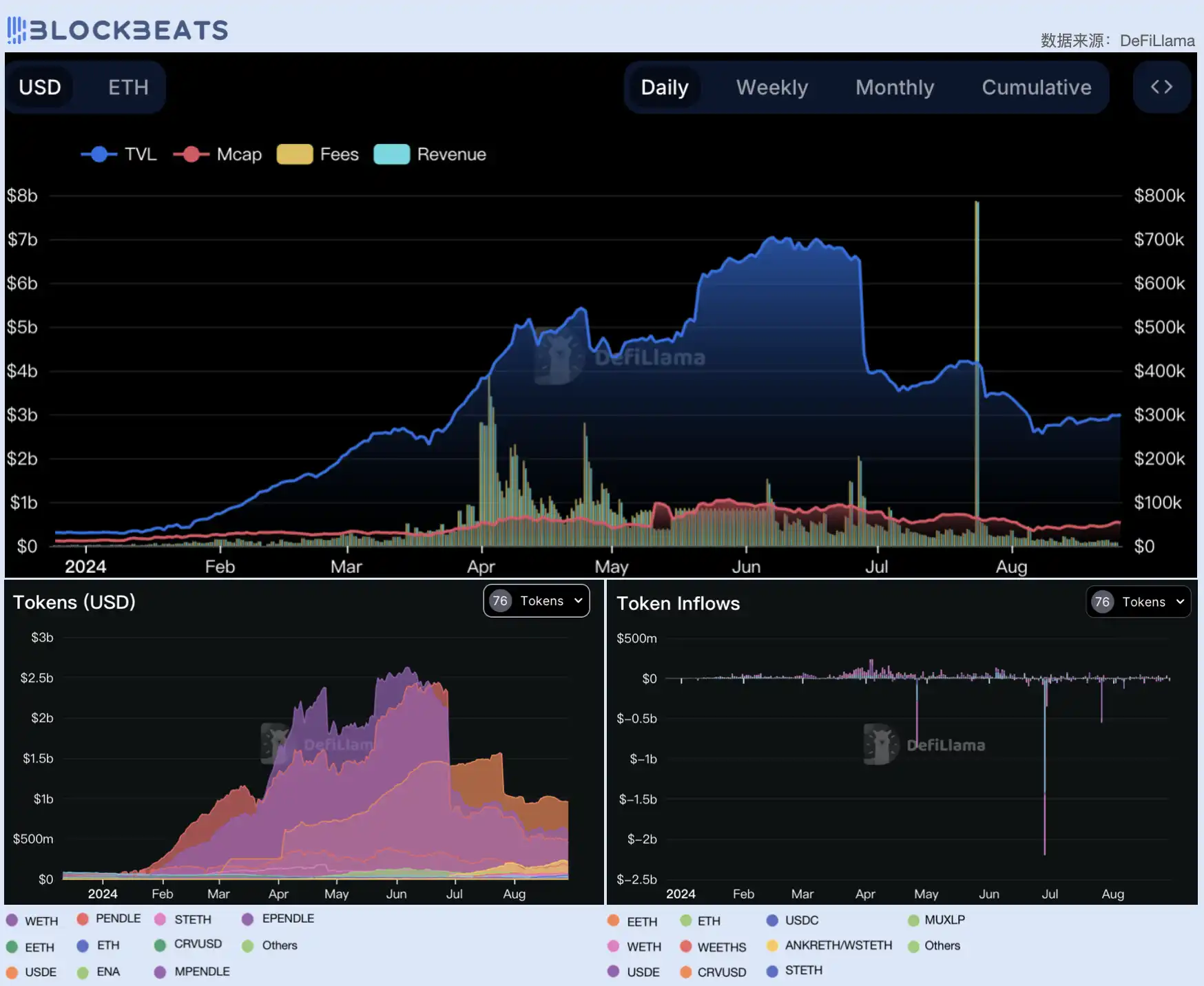 第三季度以来,各个 LST 协议空投结束叠加 Pendle 上多个金融产品到期,为 Pendle 带来了流动性考验。6 月底,Pendle 的 TVL 经历了腰斩式暴跌,从 6 月 27 日的 66 亿美元跌至 7 月 1 日的 39 亿美元,协议收入也随之腰斩。具体来看,6 月 28 日有 13 亿美元的 eETH(Ether.fi 的 LST **)和 7 亿美元的 WETH 流出 Pendle,目前 Pendle 上只有 4.45 亿美元的 eETH。